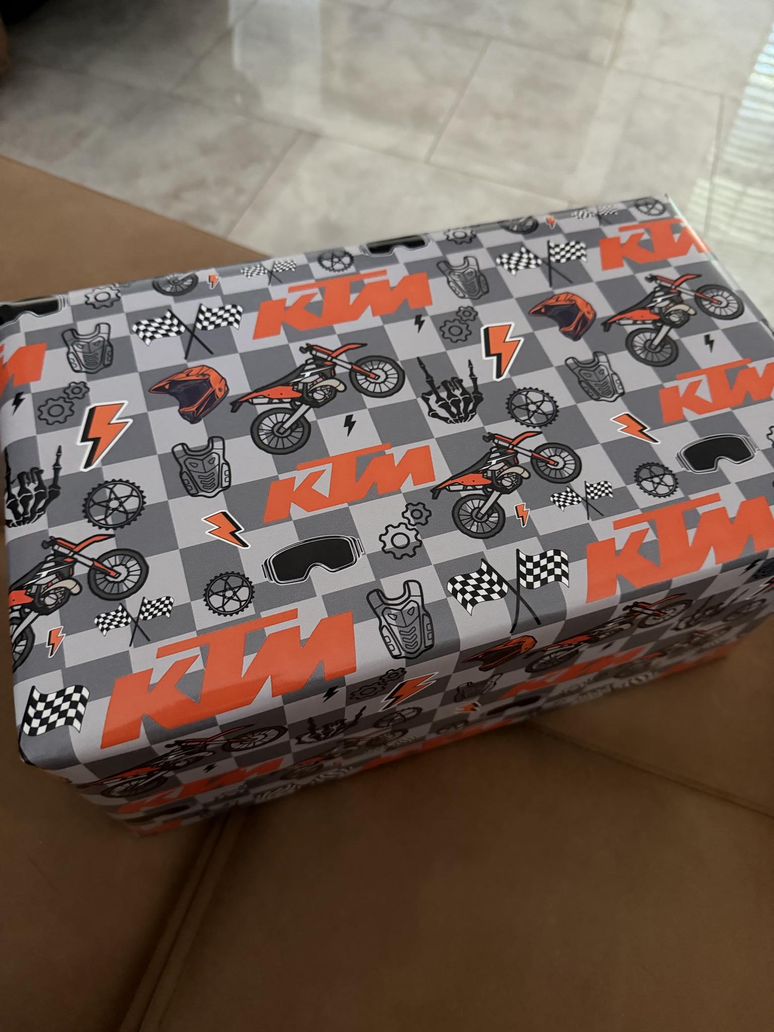 KTM Dirt bike inspired gift wrap that is perfect for wrapping gifts for your KTM Dirt Bike enthusiasts, this wrapping paper adds a fun and adventurous vibe to any gift. Ideal for birthdays, holidays, and special occasions.